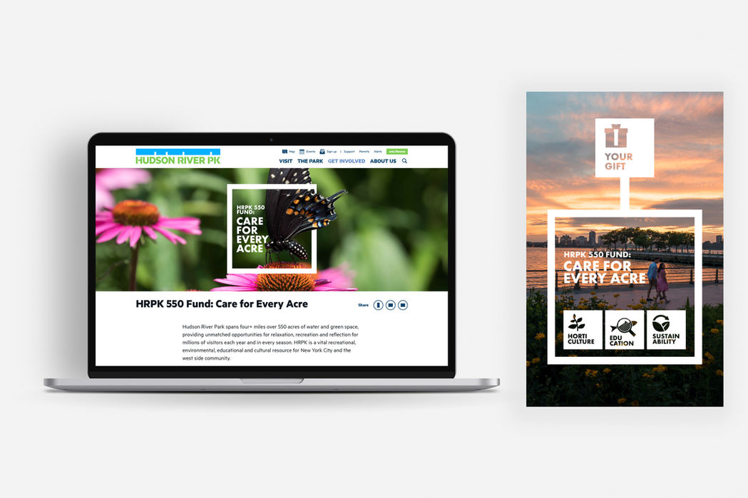 As I guided the team to clarify and nail down the narrative of the fund, the infographic naturally evolved to illustrate how the funding supports landscapes and gardens, education and estuary research, and environmental sustainability in the Park. Building on the beautiful brand designed by Pentagram for HRPK, I created a captivating design system that brings the park’s beauty front and center, instills joy, and ultimately inspires donors to support the park through the 550 Fund.